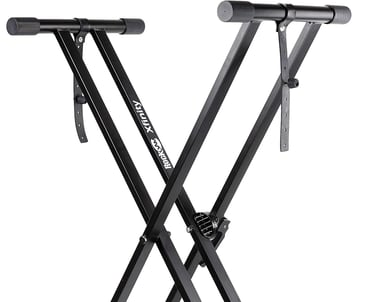 Ce support de clavier, ultra-résistant et sans montage, offre une stabilité optimale grâce à sa structure en double X et ses embouts antidérapants. Son système de réglage rapide permet une hauteur ajustable de 10 à 98 cm, bien plus flexible que les modèles classiques. Les sangles robustes maintiennent parfaitement le clavier en place, même pendant les performances.